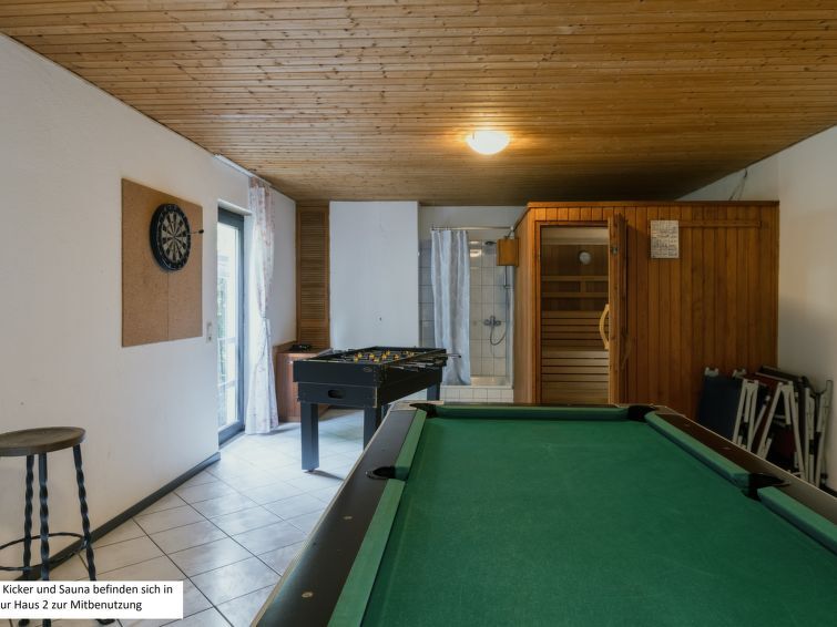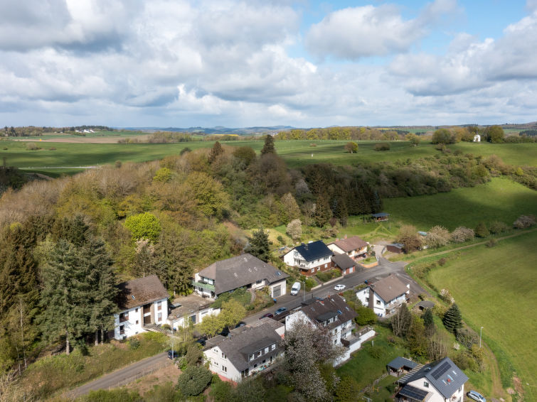 Huis met 3 woningen "Eifelnatur (Haus 2)", omgeven door bomen en velden. Aan de rand van de plaats, 300 m van het centrum, rustige, verhoogde ligging tegen een helling, 10 m van de bosrand, 8 km van het meer, aan een doodlopende weg, te midden van groen. Voor medegebruik: terrein 1.350 m2, verzorgde tuin 450 m2 met gazon 300 m2, bloemen. Tafeltennis, kinderspeelplaats (glijbaan, schommel, zandbak). In het huis: sauna (extra). Biljart, tafelvoetbal, bergruimte voor fietsen, centrale verwarming, wasmachine (voor medegebruik). Wissel van linnengoed 1 maal per week. Wissel van handdoeken 1 maal per week. Broodjesservice en drankjesservice op verzoek op aanvraag (extra). Trappenweg (25 treden) naar het huis. Levensmiddelenwinkel 5.3 km, supermarkt 5.3 km, winkelcentrum 5 km, restaurant 150 m, bar 5.3 km, bakkerij 5.3 km, café 5.3 km, fietsverhuur 10 km, bushalte "Lutzerath" 7 km, treinstation "Gerolstein" 23 km, openluchtzwembad 7.6 km, thermaalbad "Vulkaneifel-Therme Bad Bertrich" 13 km, meer (zwemmen) 7.6 km. Golfterrein (18 holes) 40 km, tennis 3.5 km, midgetgolf 7.8 km, manege 10 km, wandelroutes 50 m vanaf het huis. Attracties in de buurt: Vulkanmaare, Vulkanmuseum, Kreuzweg, Strohner Märchen, Wildpark Daun, Adler- und Wolfspark Kasselburg. Bekende meren kunnen gemakkelijk worden bereikt: Pulvermaar 1.5 km. Wandelgebied Eifelsteig 15 km. Auto noodzakelijk. De eigenaar accepteert geen jeugdgroepen. Laden en lossen van de baggage is mogelijk bij het huis. De omgeving is gevoelig voor geluidsoverlast. Gelieve geen lawaai te maken en de rust te bewaren.