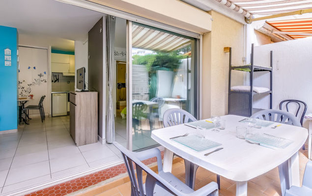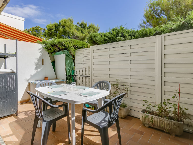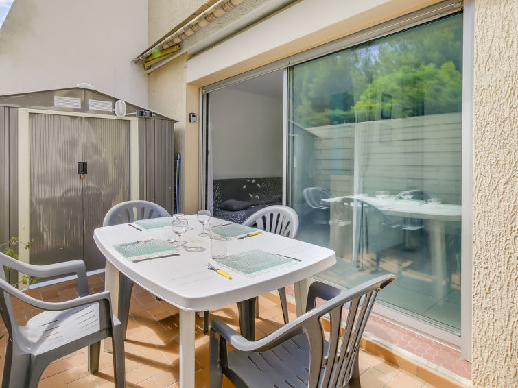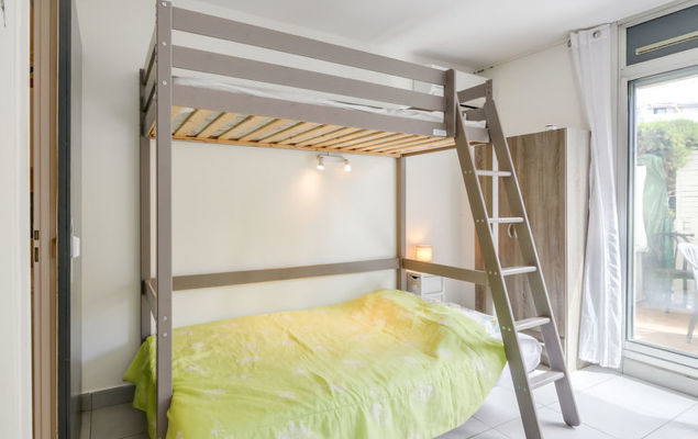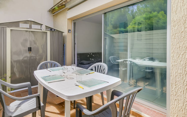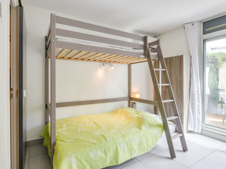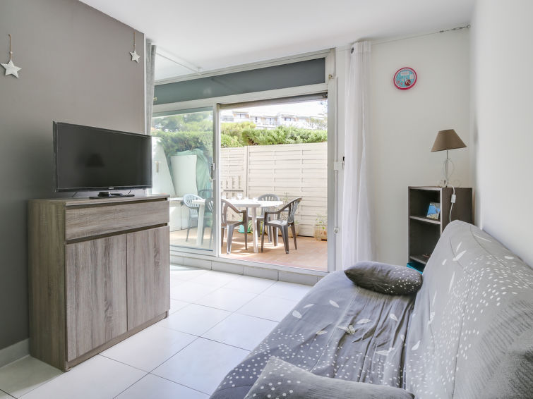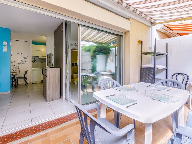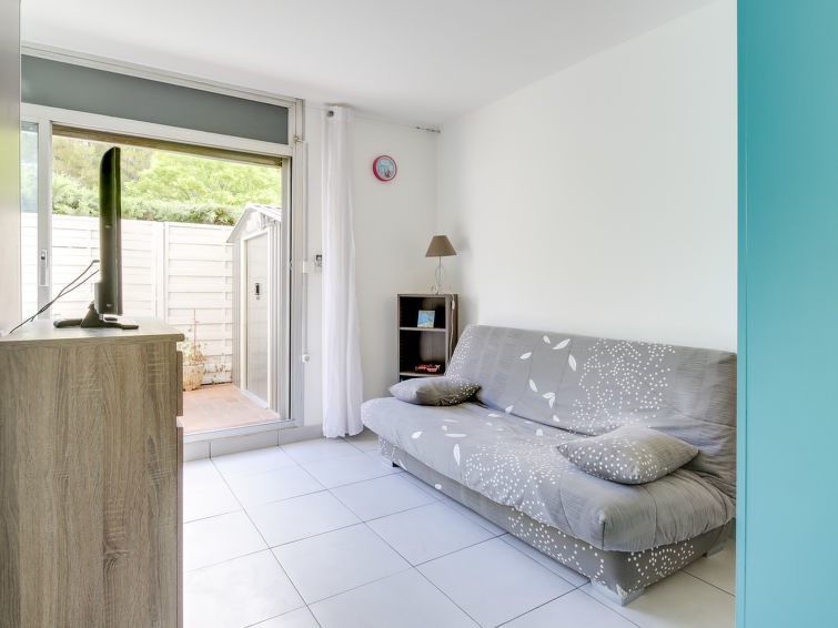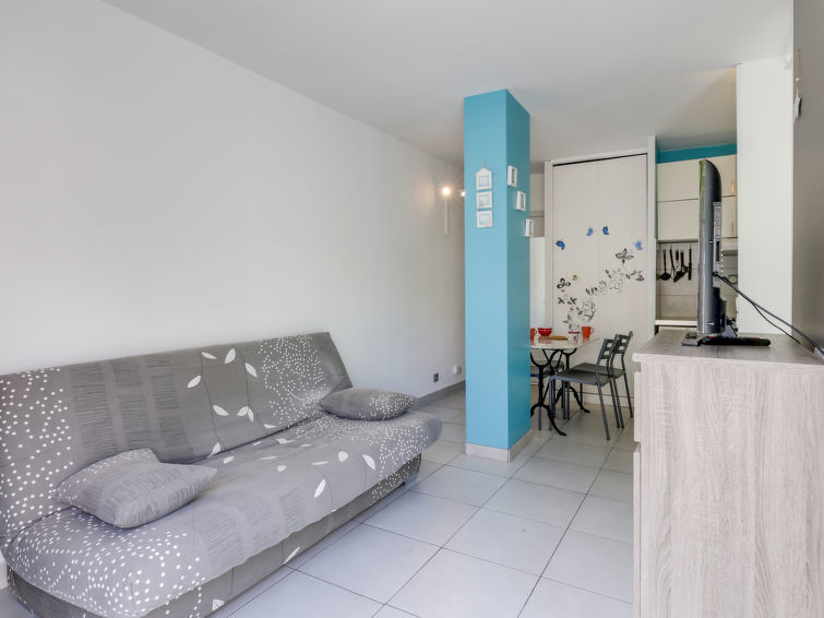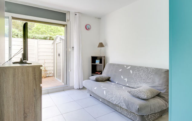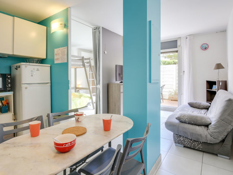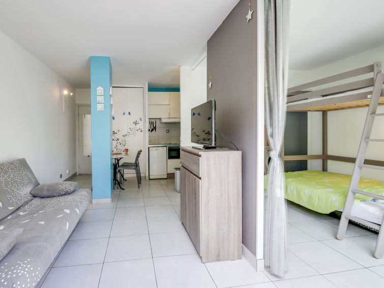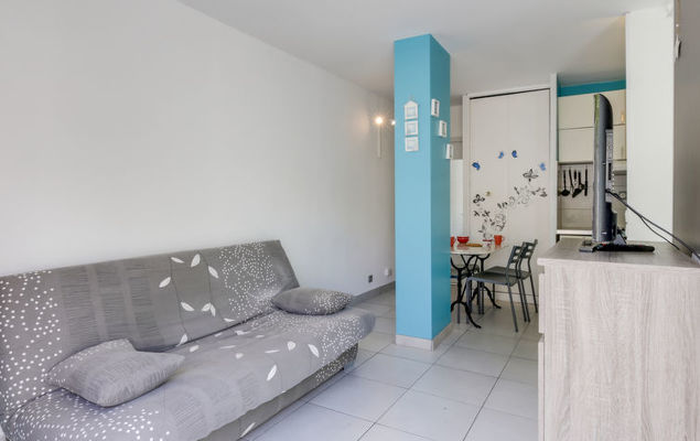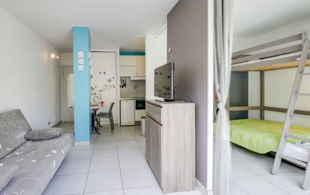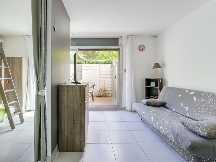 Studio 1-kamer 27 m2, op de begane grond. Doelmatig en comfortabel ingericht: woon-/eetkamer met 1 2-pers divanbed (130 cm, lengte 190 cm), TV (Flatscreen TV), air-conditioning. Uitgang naar het terras. Kookhoek (mini-oven, afwasmachine, 2 keramische glas kookplaten, broodrooster, waterkoker, magnetron, diepvriezer, elektrische koffiemachine). Douche/WC. Terras 14 m2, op het noordoosten gelegen. Terrasmeubelen. Ter beschikking: wasmachine, strijkijzer. Internet (Internet (WiFi), gratis). Parkeerplaats nr. 383. Let op: TV alleen FR. Rookmelders.