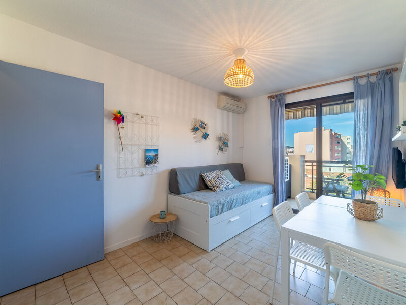 Appartement 2-kamers 23 m2 op de 4e verdieping. Comfortabel ingericht: woonkamer met 1 uitschuifbaar bed (2 pers. 2 x 80 cm, lengte 190 cm), TV (Flatscreen TV), air-conditioning. Uitgang naar het terras. 1 kamer met 1 2-pers bed (1 x 140 cm, lengte 190 cm). Kookhoek (2-pits kookplaat, broodrooster, waterkoker, elektrische koffiemachine, pads voor de koffiemachine (Nespresso) extra, combimagnetron). Badkamer, aparte WC. Elektrische verwarming. Terras 7 m2. Ter beschikking: strijkijzer, haardroger. Internet (WiFi, gratis). Parkeerplaats nr. 574 op 500 m. Woning aan de straatzijde. Niet rokers woning. Maximaal 1 huisdier/hond toegestaan. Rookmelders. 83070001350BQ