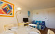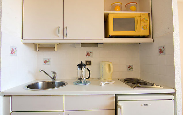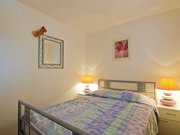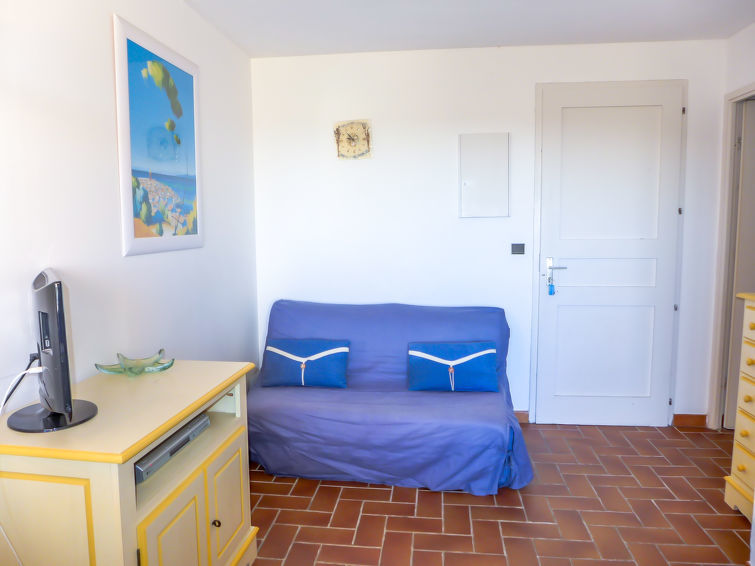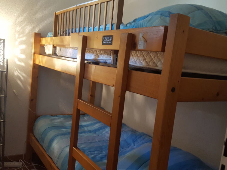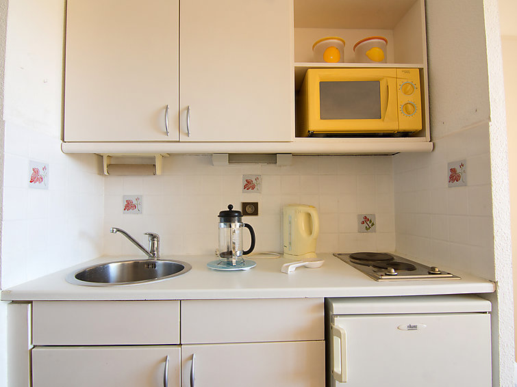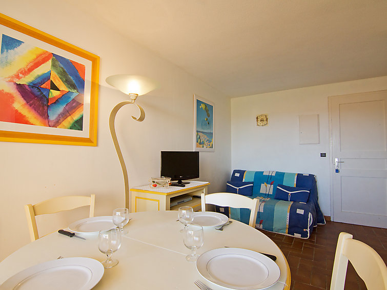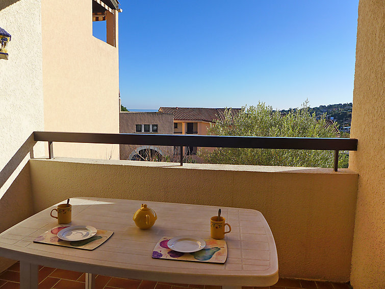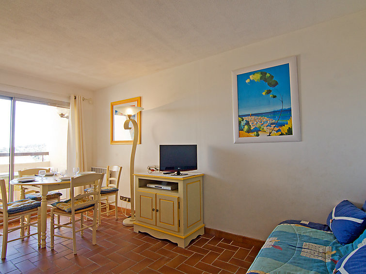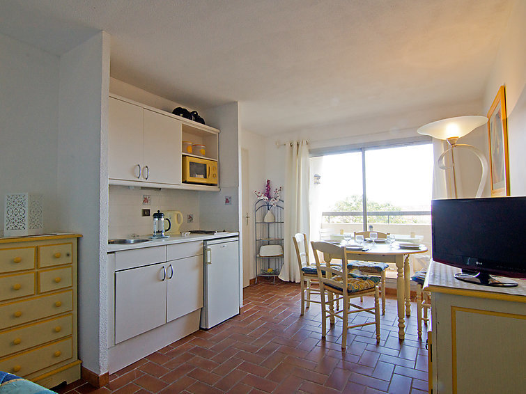 Appartement 2-kamers 40 m2 op de 1e verdieping. Het objekt is geschikt voor 2 volwassenen + 2 kinderen. Eenvoudig ingericht: woonkamer met panoramavenster met TV (Flatscreen TV), DVD en ventilator. Uitgang naar het terras. Cabine, zonder kast met 1 x 2 stapelbedden (80 cm, lengte 190 cm), ventilator. 1 kamer met 1 2-pers bed (1 x 140 cm, lengte 190 cm), ventilator. Kookhoek (2 inductiekookplaten, broodrooster, waterkoker, magnetron, elektrische koffiemachine). Douche, aparte WC. Elektrische verwarming. Terras 5 m2, overdekt. Terrasmeubelen, ligstoelen (2). Beperkt uitzicht op zee. Ter beschikking: wasmachine, strijkijzer, haardroger. Internet (Internet (WiFi), extra). Parkeerplaats nr. A151/472. Let op: 1 klein huisdier/hond toegestaan. TV alleen FR. Rookmelders. 83107000216J5