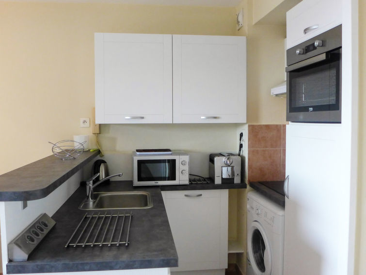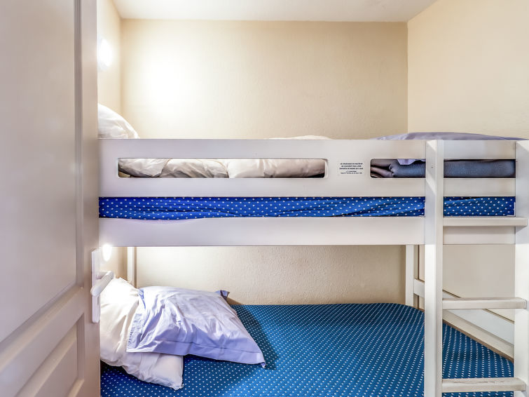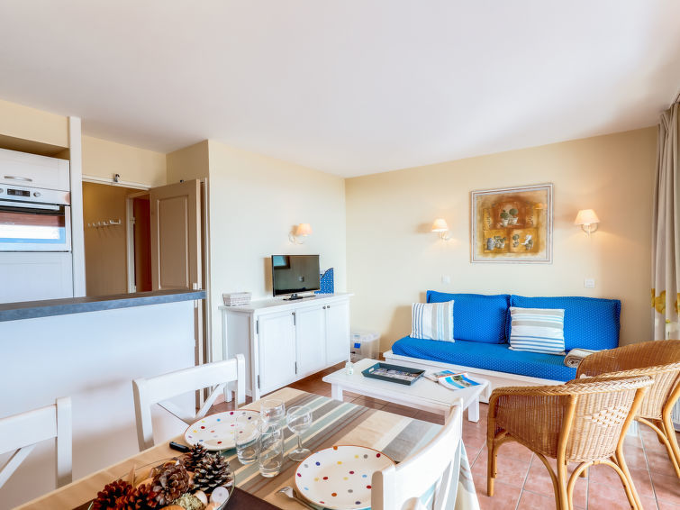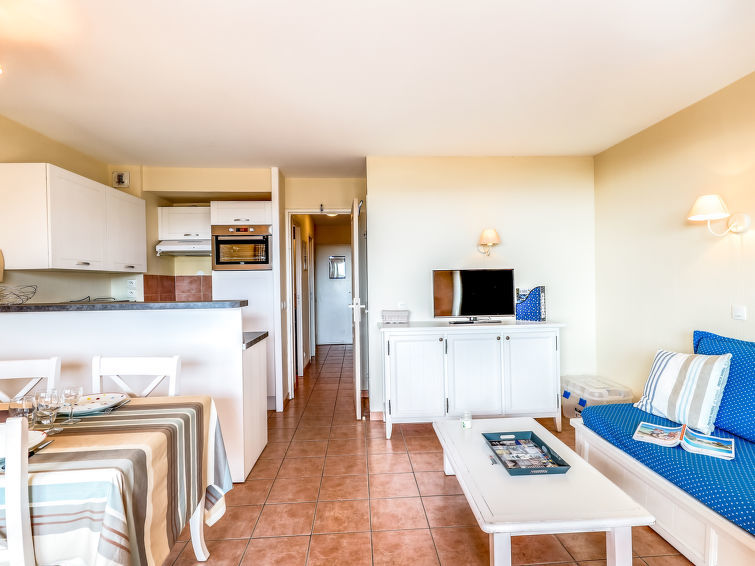 Appartement 3-kamers 38 m2 op de 2e verdieping. Comfortabel en mooi ingericht: woon-/eetkamer met TV. Uitgang naar het terras. 1 kleine kamer met 1 2-pers bed (140 cm, lengte 200 cm). Cabine met 1 x 2 stapelbedden (80 cm, lengte 190 cm). Kookhoek (oven, afwasmachine, 4 keramische glas kookplaten, broodrooster, waterkoker, magnetron, diepvriezer, elektrische koffiemachine). Badkamer, douche/WC. Elektrische verwarming. Terras 10 m2, overdekt, op het oosten gelegen. Terrasmeubelen. Zeer mooi uitzicht op zee en het landschap. Ter beschikking: wasmachine. Internet (Internet (WiFi), extra). Parkeerplaats bij het huis. Let op: niet rokers woning. Rookmelders. 83107000388NS