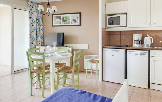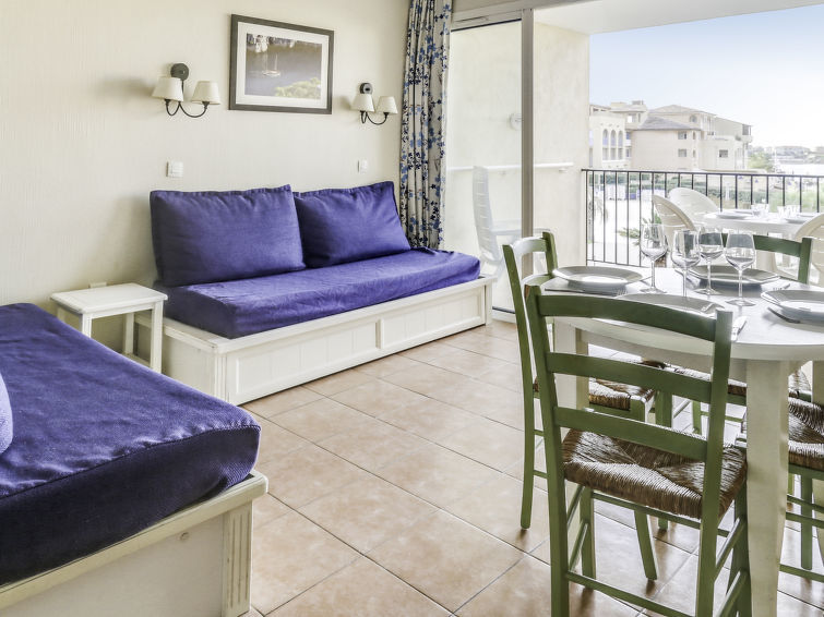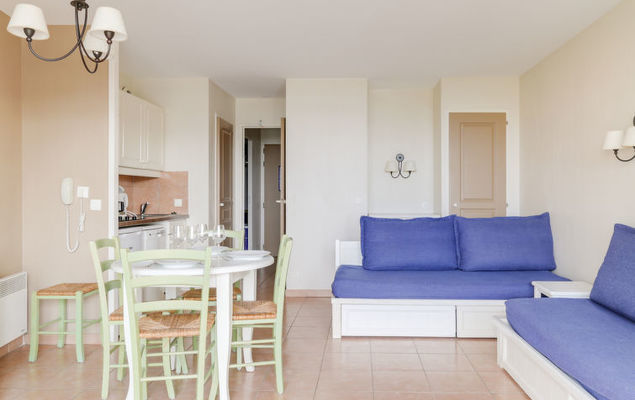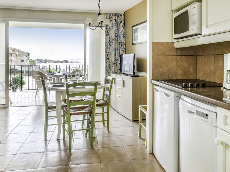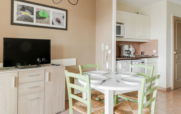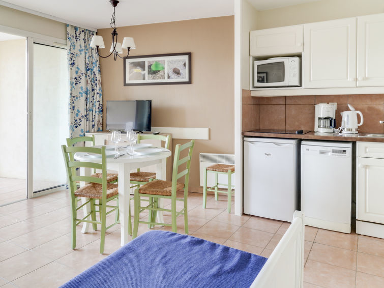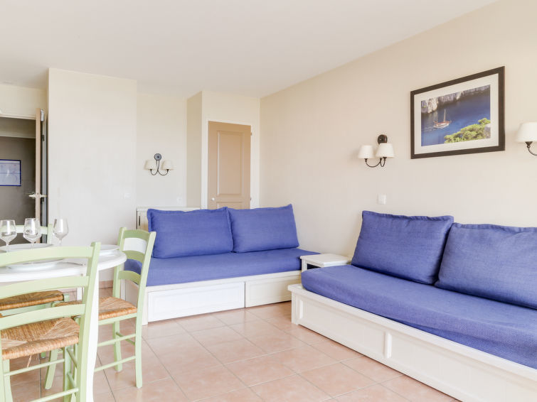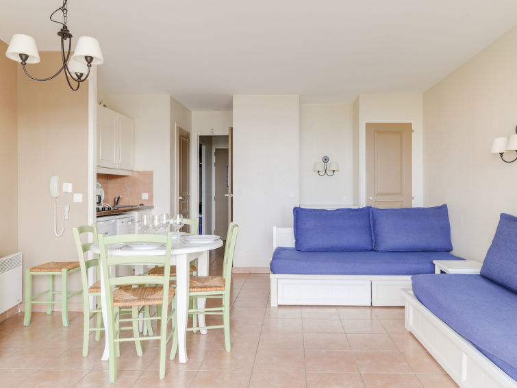 Appartement 2-kamers 32 m2 op de 1e verdieping. Mooi ingericht: woon-/eetkamer met 2 bedden (80 cm, lengte 190 cm), TV (Flatscreen TV). Uitgang naar het terras. 1 kamer met 1 2-pers bed (1 x 140 cm, lengte 190 cm). Kookhoek (afwasmachine, 4 keramische glas kookplaten, broodrooster, waterkoker, magnetron, elektrische koffiemachine). Douche, aparte WC. Elektrische verwarming. Terras 9 m2, overdekt, op het zuidwesten gelegen. Terrasmeubelen. Mooi uitzicht op zee en het zwembad. Ter beschikking: Internet (Internet (WiFi), extra). Parkeerplaats nr. 496 (Niveau 1) (overdekt), hoogte 190 cm, breedte 232 cm. Let op: maximaal 1 huisdier/hond toegestaan. TV alleen FR. Rookmelders.